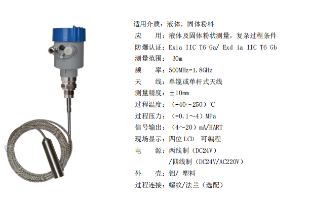 特 点:由于采用了..的微处理器和独特的 choDiscovery 回波处理技术,物位计可以应用于各种复杂工况。多种过程连接方式及探测组件的型式,使得 60X 系列物位计适用于各种复杂工况及应用场合。如:高温、高压及小介电常数介质等。基于时间行程原理的测量仪表,雷达波以光速运行,运行时间可以通过电子部件被转换成物位信号。探头发出高频脉冲并沿缆式或杆式探头传播,当脉冲遇到物料表面时反射回来被仪表内的接收器接收,并将距离信号转化为物位信号。